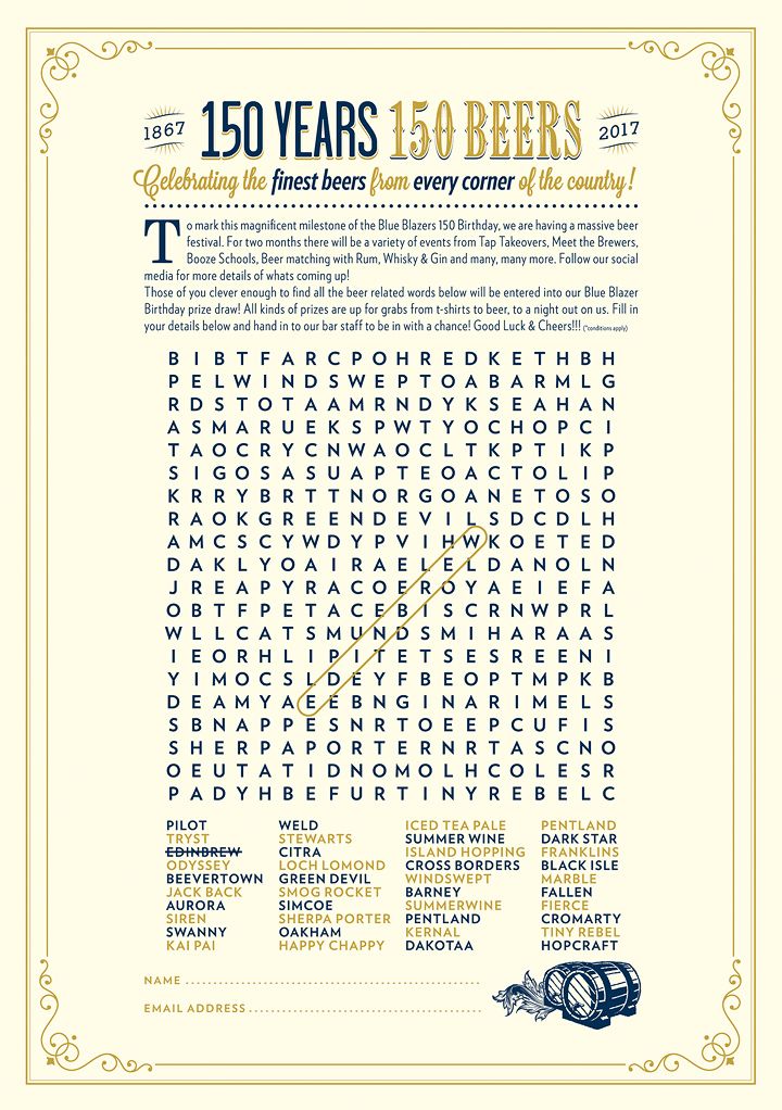 150 Years, 150 Beers – wordsearch (The Blue Blazer)