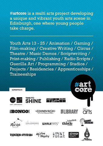 We were invited to create a new logo and promotional campaign for a new Edinburgh-wide arts project based at Out of the Blue Drill Hall, in the heart of Leith. Artcore offer free opportunities for people aged 13-25 to get involved in arts and support aspiring artists and performers to develop their talent.