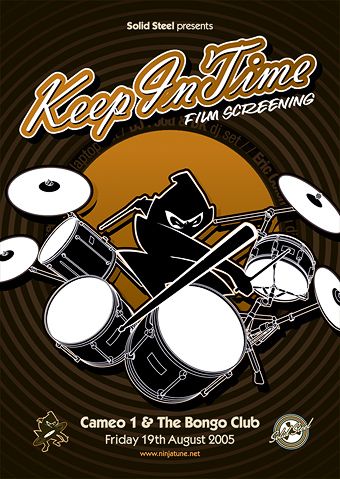 After working on the publicity for Ninja Tune’s Solid Steel club nights in the city, we were invited to design the publicity for the launch of their new movie ‘Keep In TIme’, which was to be launched in the Edinburgh International Film Festival. The movie was all about ‘the Break’ and featured influential drummers together with master turntabalists.