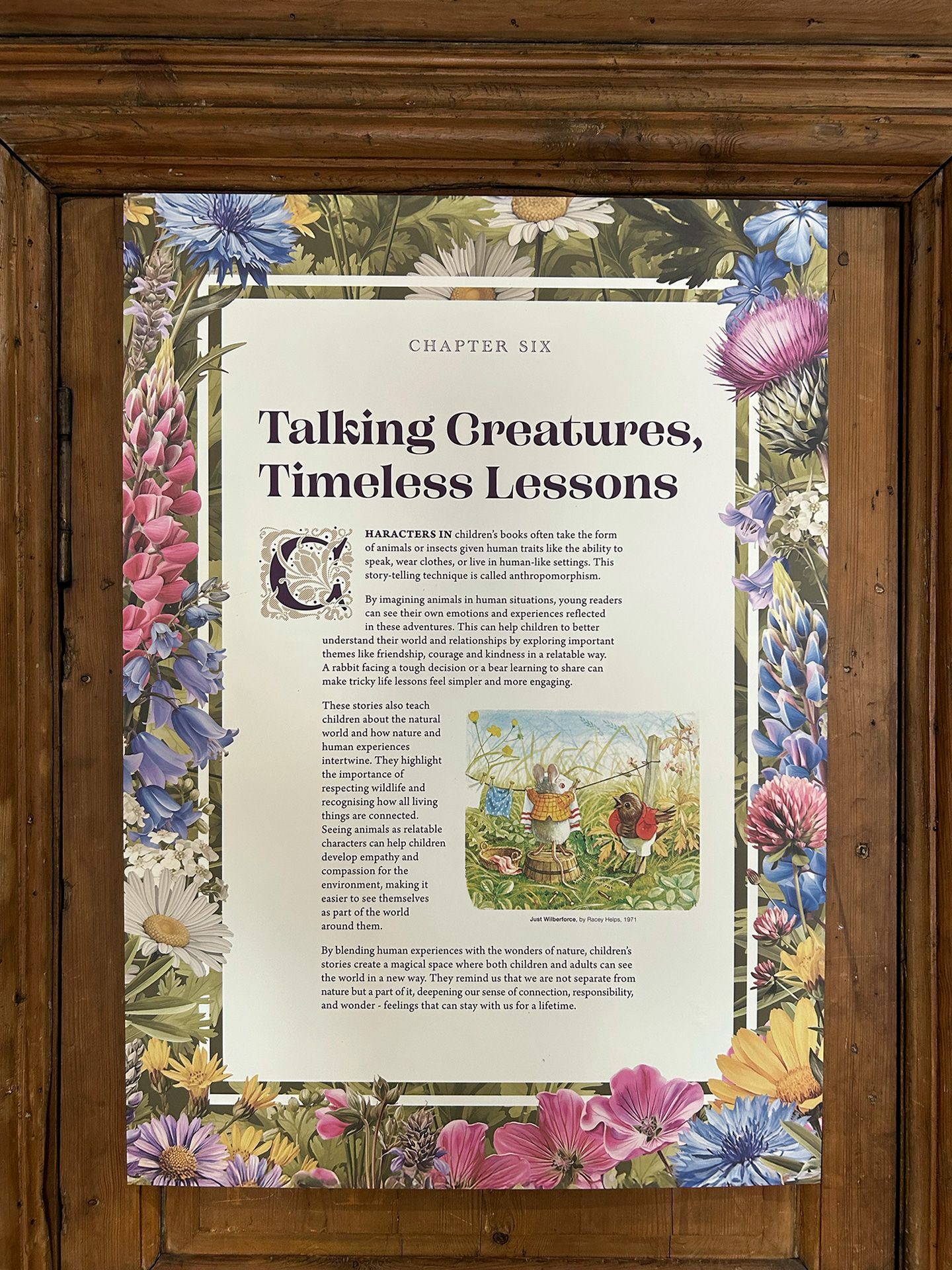 We were supplied with some beautiful vintage children’s book illustrations for the project. Which helped inspire the whole rich, maximal design style used. A lush floral border was used throughout, and helped pull all the assets and exhibition together as a whole.