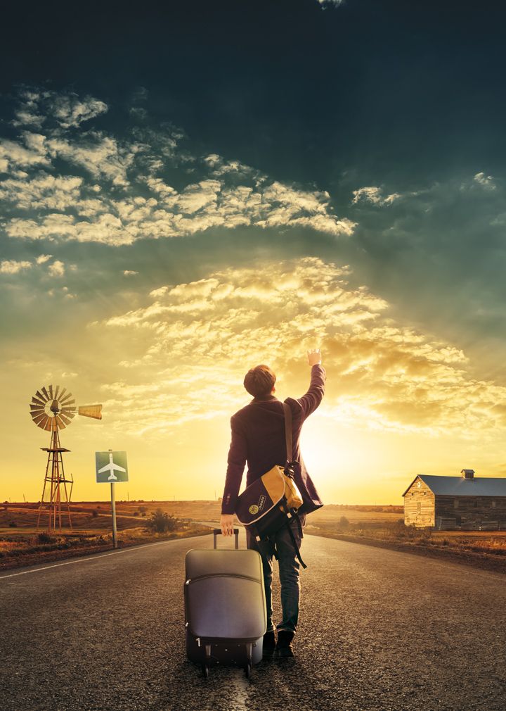 Without any press shots, the creation of this book jacket-esque promotional image, presented a challenge. The entire image had to be created from scratch, with every element being sourced separately, the figure, bag, suitcase, road, sky, clouds, sign, scenery…
