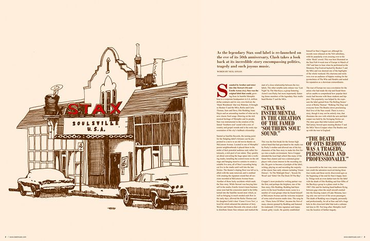 We created this image for a magazine feature for the legendary Stax record label in Clash Magazine. The original photo was a bit dull, so we drew this ink illustration by hand, scanned and colored it, to better capture the classic mood of the article.